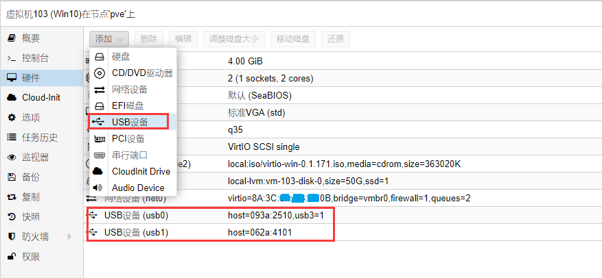 7、关键的步骤来了,直通独显GPU,打开文件  /etc/pve/qemu-server/103.conf(我的Win10在PVE顺序是103),添加这两行内容后保存: