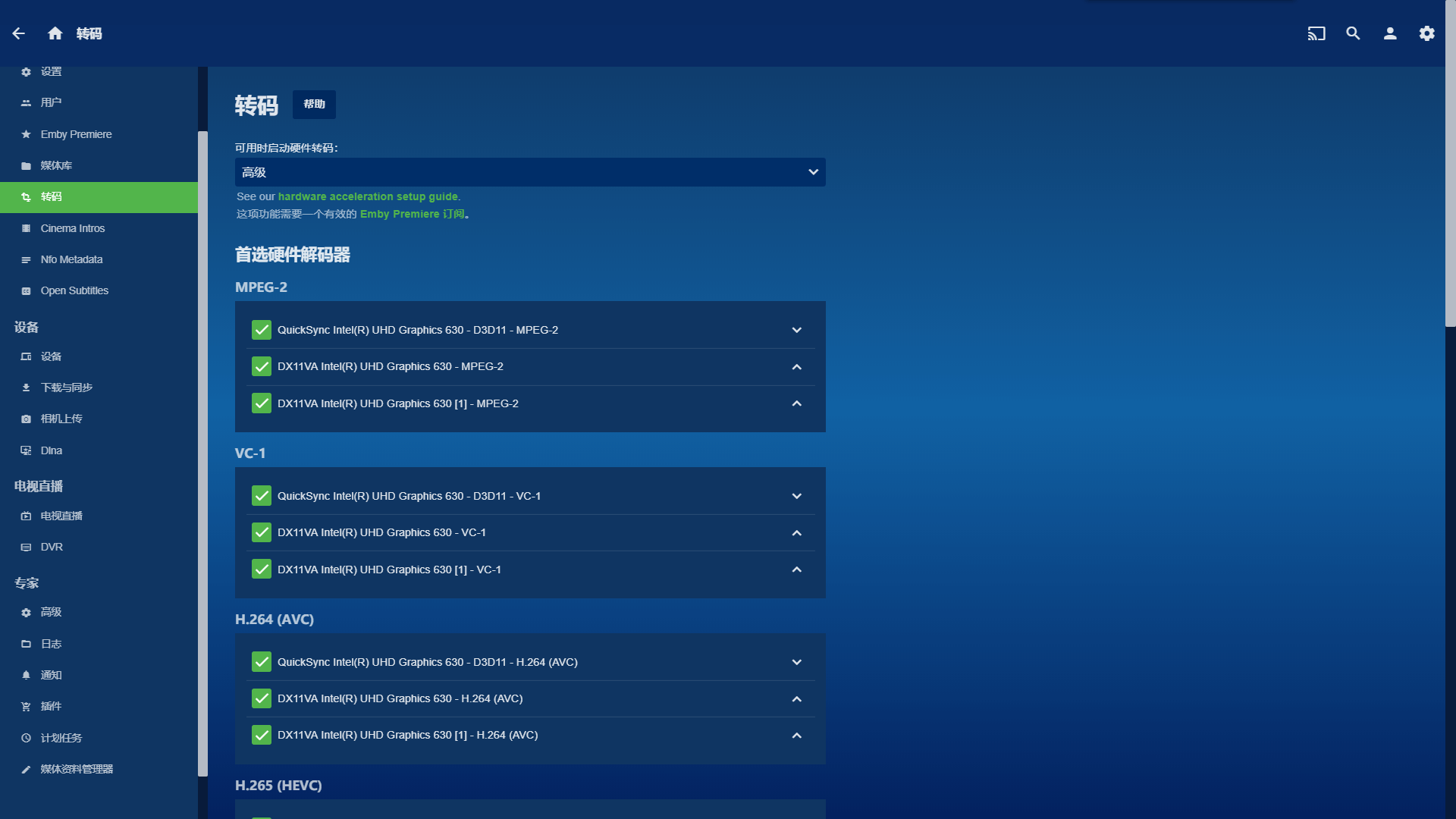 9、完成上述设置以后,安装emby服务端并做好相关的设置,转码这里的“可用时启动硬件转码”(注意:开启此功能需要有emby会员)选“高级”并在“首选的硬件解码器”上全部打勾: