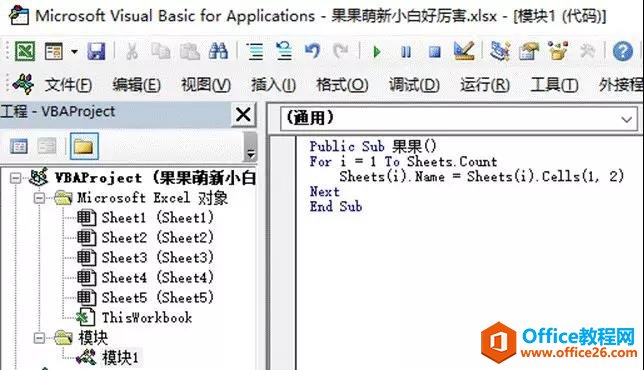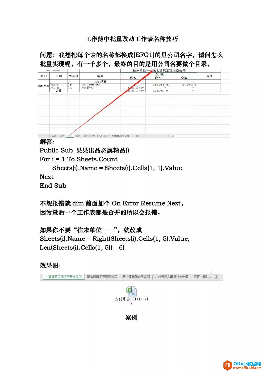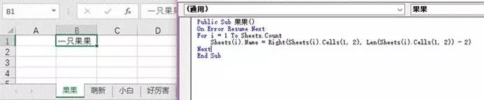 最终完整代码: Public Sub果果() On Error Resume Next For i=1 To Sheets.Count Sheets(i).Name=Right(Sheets(i).Cells(1,2),Len(Sheets(i).Cells(1,2))-2) Next End Sub