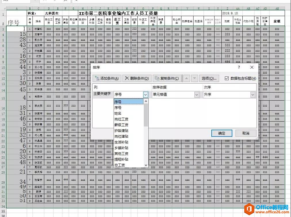 第三步,从A列序号选中所有表格区域,点击排序,按第二个序号字段进行排序。