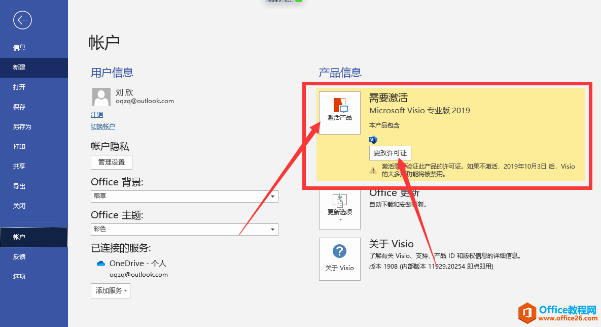 进入visio,点文件-账户,查看激活状态。如果没有激活,就点“激活产品”,如果要更密钥,就点“更改许可证”
