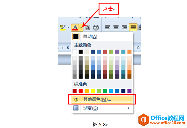 实现方法很简单,点击字体颜色右侧的小三角选择“其他颜色…”,如图: