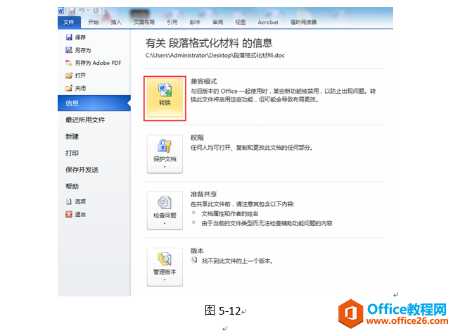 那么,怎么解决这种问题呢?我只介绍最简单的一种方法好了。执行“文件信息转换”就可以将老版本的文档转换成新版本的文档了。