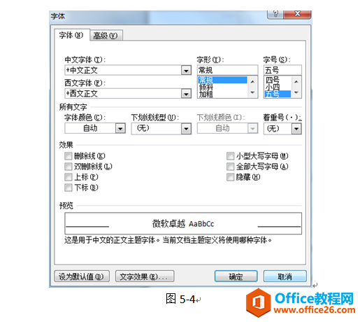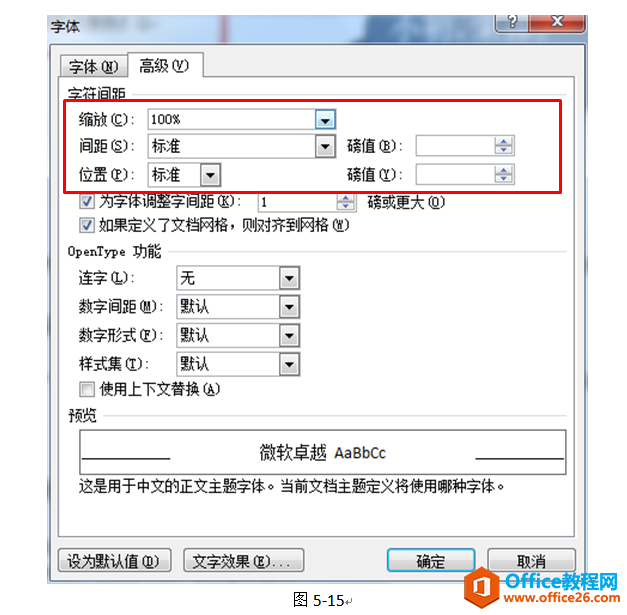 在“字体”对话框中的“高级”选项卡中,我们可以实现一些文本的其他效果设置,如图: