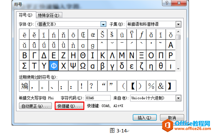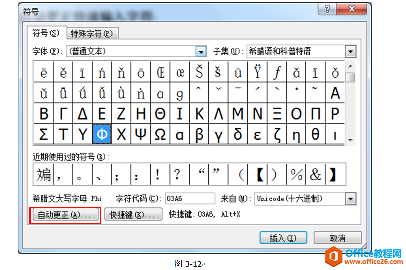 在符号对话框中选择“子集”为“希腊语和科普持语”可以找到直径符号,选择直径符号后点击“自动更正”按钮。