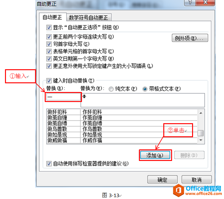 在弹出的“自动更正”对话框中,你只要在“替换”框中输入你想拿来替换的字符就可以了,如下图: