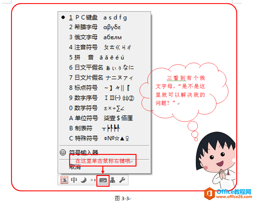 软键盘是输入法状态条上的一个小“机关”。以五笔输入法为例,启用软键盘的方式如下图: