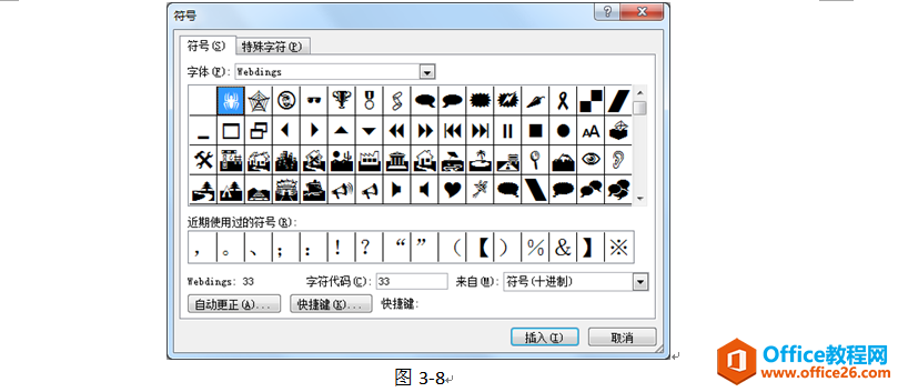 这里会显示一些常用的符号和我们最近使用过的符号。单击“其他符号…”,打开“符号”对话框,如下图: