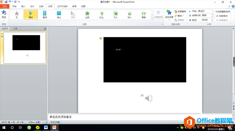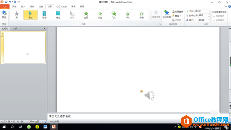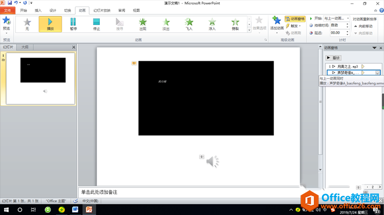 第三步:选中插入幻灯片窗格的小喇叭图标,单击“动画”选项卡,在“动画”组中单击“播放”按钮。
