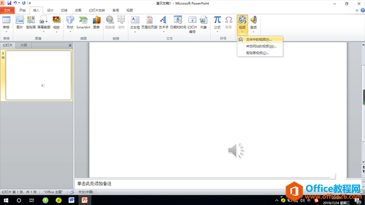 第四步:单击“插入”选项卡,在“媒体”组选择“视频”按钮,在下拉菜单中选择“文件中的视频”。