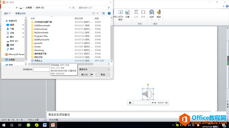 第二步:在打开的“插入音频”对话框中找到保存的音频文件,选择文件后单击“插入”。
