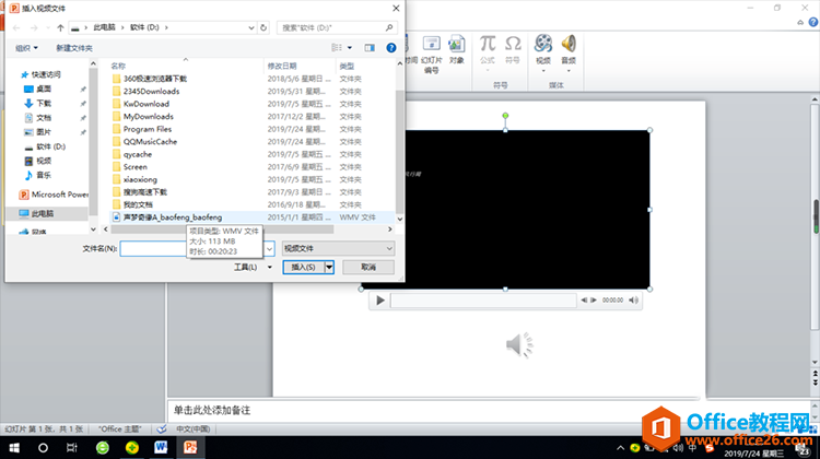 第五步:在打开的“插入视频文件”对话框中找到保存的视频文件,选择文件后单击“插入”。