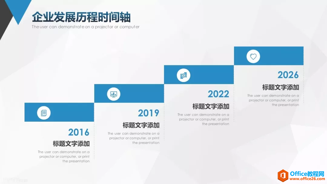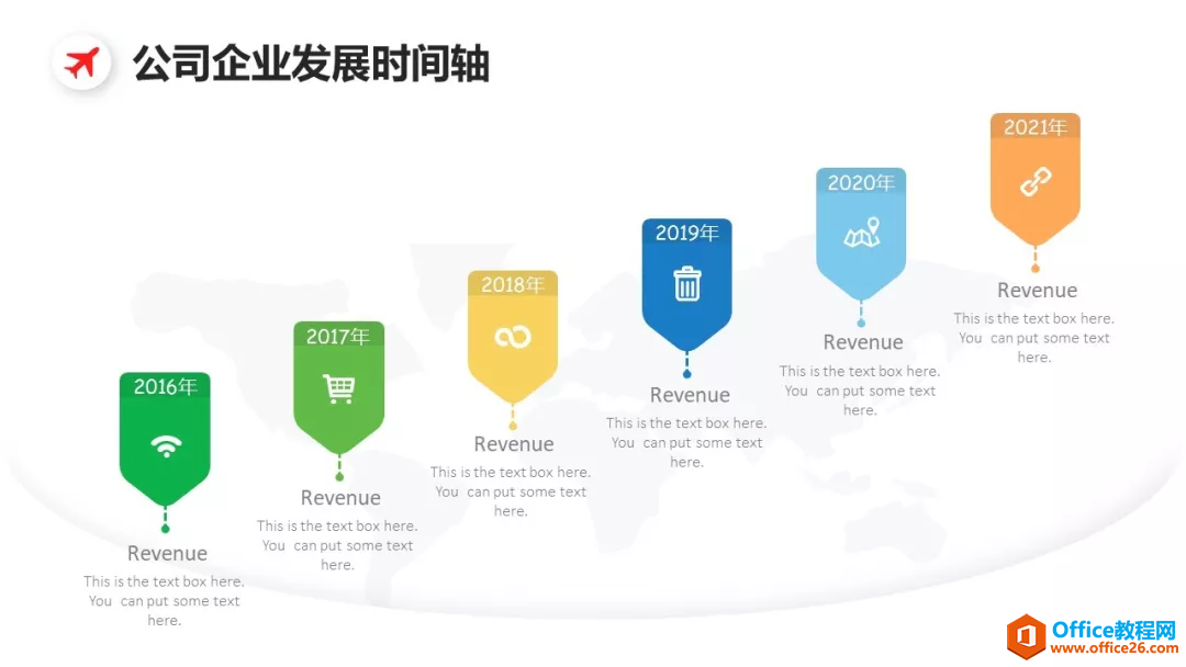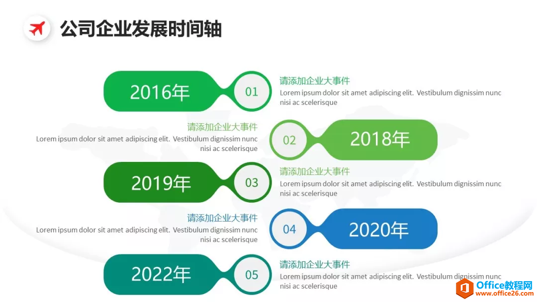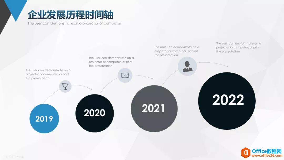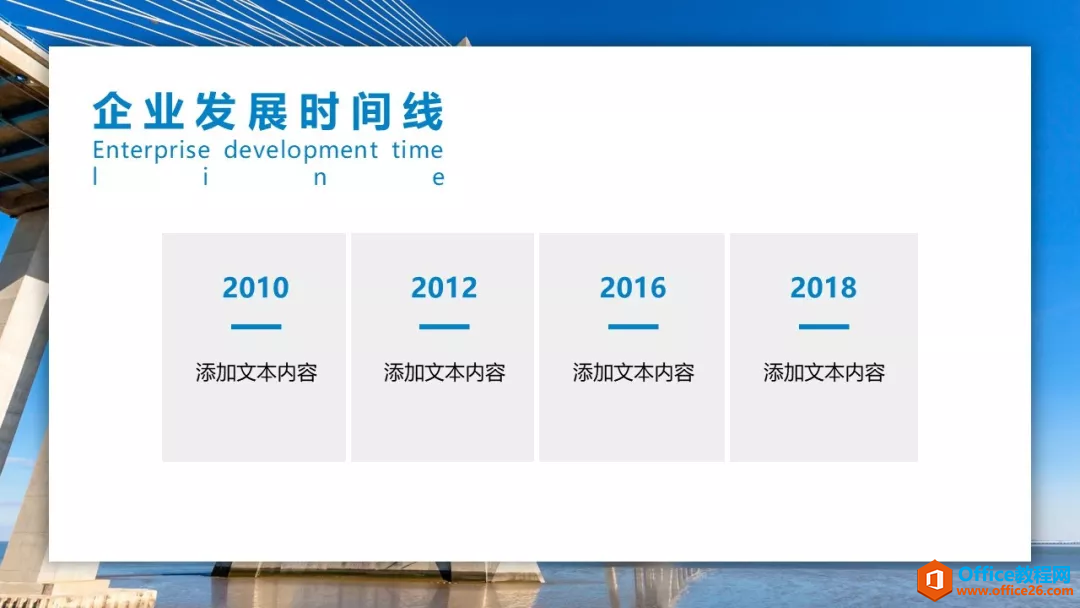 在PPT当中,时间轴是一个非常重要的一个版块,很多PPT会用它来表示公司的发展历程和项目进度。