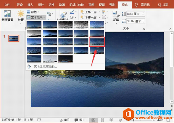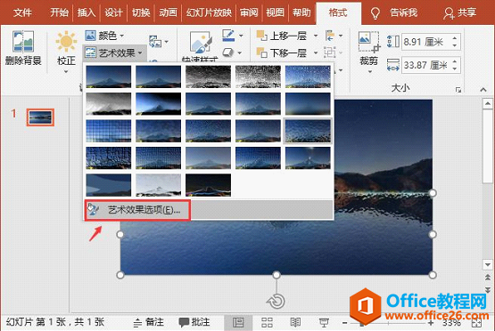 (3)点击【图片格式】-【格式】-【艺术效果】按钮,在弹出的菜单中选择“艺术效果选项”命令。