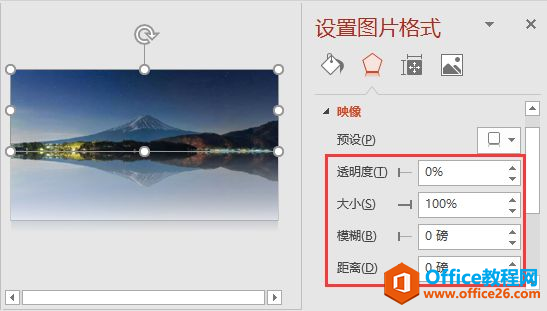 (2)打开“设置图片格式”任务窗格,展开“映像”栏,设置“透明度”为”0%“,“大小”为”100%”,“距离”为“0”(这里的参数值可根据实际情况进行设置)。