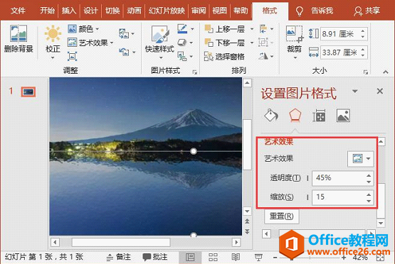 (4)打开艺术效果的参数设置窗口,设置”透明度“为”45%“,”缩放“为”15“(这里的参数值可根据实际情况进行设置)。