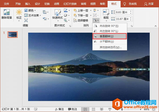 (1)打开PPT,插入一张拍摄的风景图片。选择图片,按住【Ctrl】键拖动它复制一张。然后点击【图片格式】-【格式】-【排列】-【旋转】按钮,在弹出的菜单中选择“垂直翻转”命令,将图片垂直翻转。