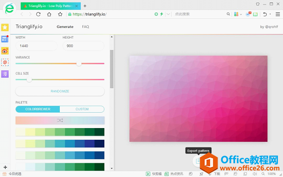 操作十分简单:打开该网站,只需要简单设置图片大小、颜色、色块大小等参数,就可以快速生成漂亮的多边形纹理背景。同时还可以实时预览,而且还支持下载PNG和SVG格式图片。
