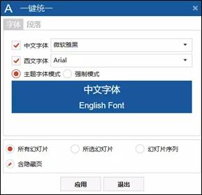 提示:如果当前PPT中字体过多的话,就需要进行多次替换操作哦!四、通过NT插件一键统一字体除了上述的PPT自带功能,我们还可以通过PPT插件——Nordri Tools来实现一键统一字体。安装该插件后,利用“一键统一”功能,即可统一所有幻灯片字体或统一任意选中的幻灯片字体。