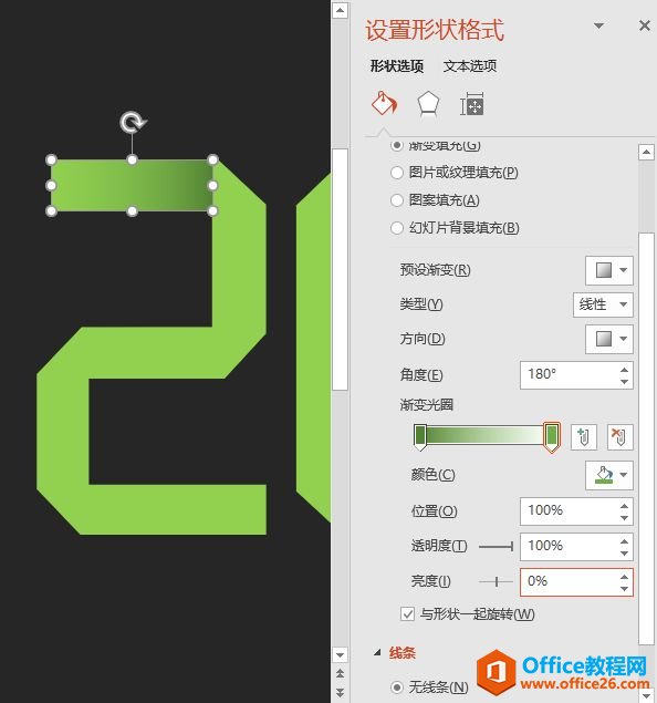 (4)打开“设置形状格式”任务窗格,选中“渐变填充”单选按钮,由于文本颜色为草绿色,因此,这里我们设置矩形的渐变颜色为深绿色到深绿色(注意:渐变颜色比文本颜色略深即可),然后选择右侧的颜色滑块,设置“透明度”为“100%”,亮度为“0%”。在“线条”栏中选中“无线条”单选按钮取消矩形轮廓线,效果如下图所示。