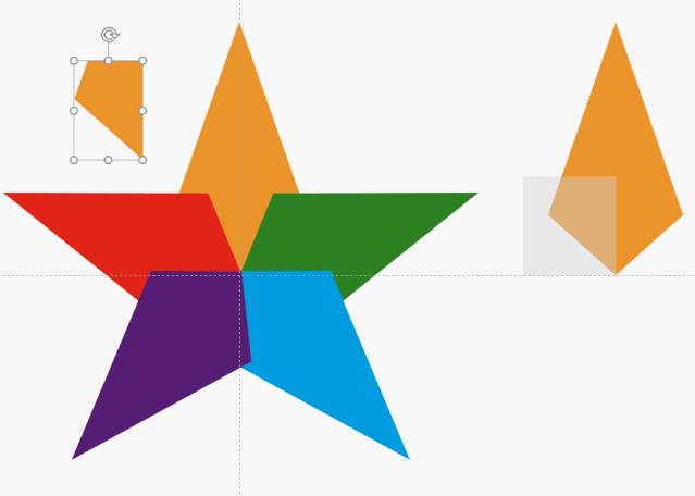 但绘制完毕后,发现有个问题,红色有一部分是在橙色的底部,所以我们需要裁切橙色的一部分,挡住红色部分。可以利用一个方块和三角图形进行拆分。