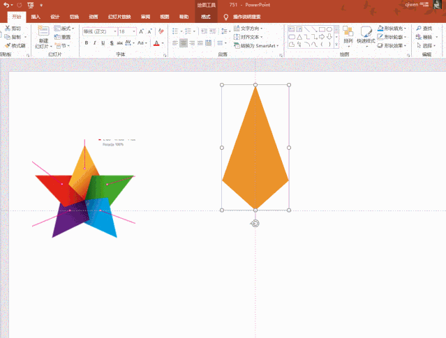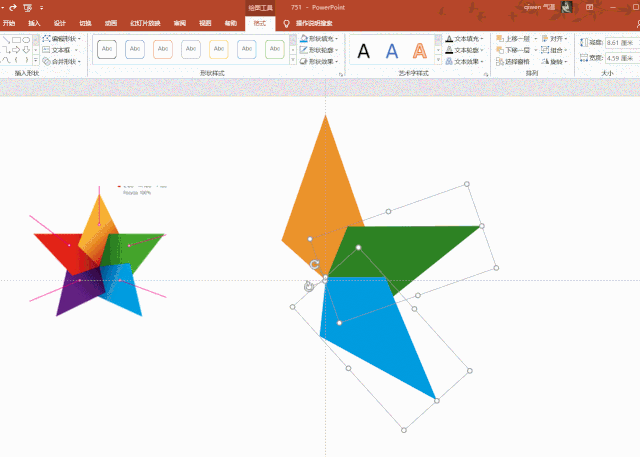 插入一个等腰三角形,细长一点,在按住ctrl键复制出来一个,拖曳旋转柄180,然后调整的短一点,最后利用组合功能将其组合成一个图形。 同样复制图形,进行旋转,注意旋转的时候,水平线,以及旋转点永远在五角星的整中心。