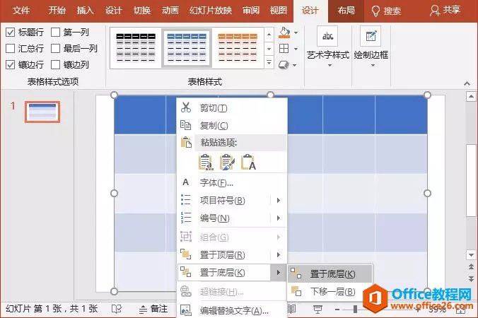 (3)调整表格大小,确保表格与图片大小一致(覆盖图片)。在表格上单击鼠标右键,在弹出的快捷菜单中选择“置于底层”命令。