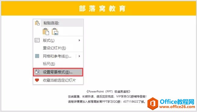(1)在页面上单击鼠标右键,选择“设置背景格式”命令。