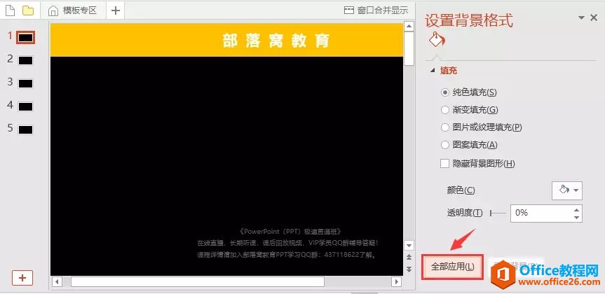 可以看到,只更改了当前页面背景,如果要将整个PPT的所有页面背景都更改为黑色,怎么办?很简单,一步就能实现。