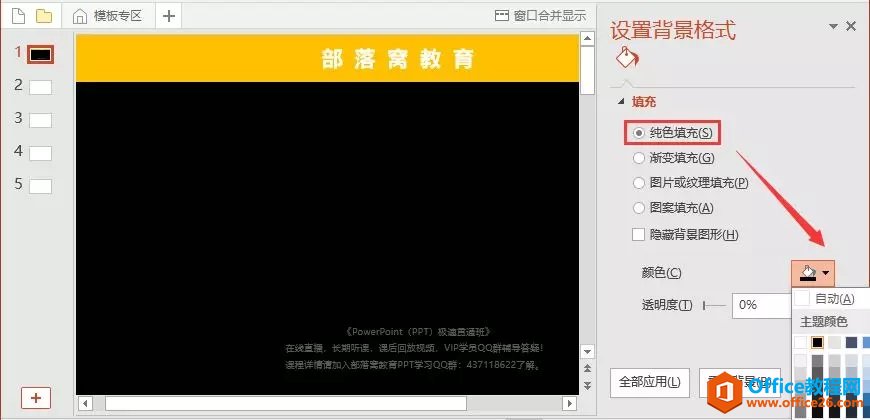 (2)打开“设置背景格式”任务窗格。在“填充”栏中选中“纯色填充”选项。然后在“颜色”列表中选择需要的背景颜色,这里选择”黑色“。即将白色背景更改为黑色背景了。