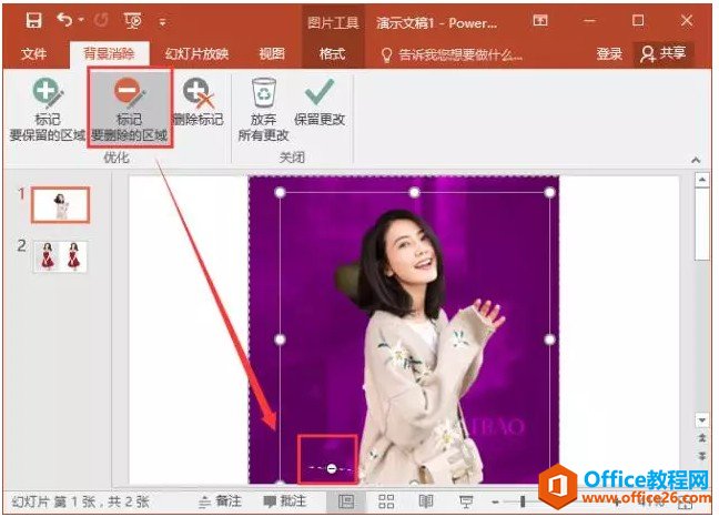 系统默认识别的保留和删除区域往往不是很理想,所以需要通过“标记要保留的区域”或“要删除的区域”两个按钮,来帮助我们完成要保留的区域和要删除的区域的。➤标记要保留的区域:表示在紫红色的区域做标记可以保留下原本默认被删除的部分。➤要删除的区域:表示在原图背景的区域做标记可以额外删除默认没有被删除的部分。(4)在图片上标记完成后,单击“保留更改”按钮或鼠标点击空白处,女神就被完整的抠取下来了。