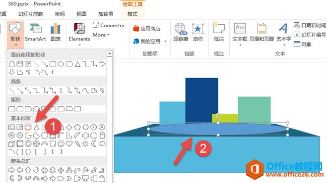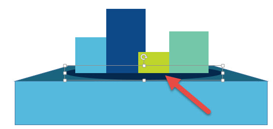注意这个阴影其实也是“假”的,不是用到真正的阴影设置,而是拖拽一个椭圆,放置在柱形图的下方而已。拖拽置下图箭头2处效果。
