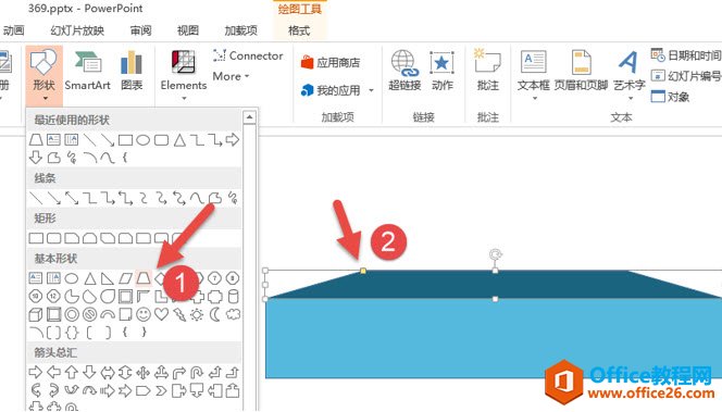 接着在插入一个梯形。(下图箭头1处),将梯形的底边调至与长方形长边一样。然后拖拽梯形的黄色标记到合适的角度,从视觉点有“透视”的效果。(下图箭头2处)