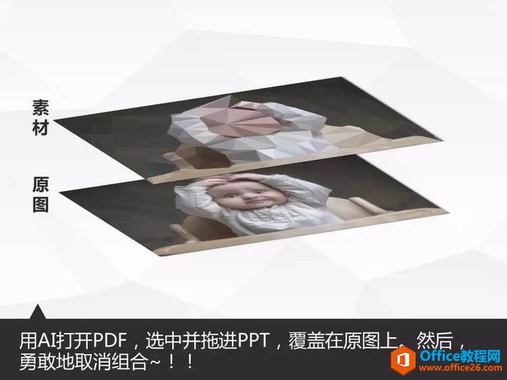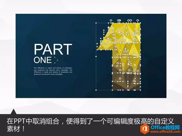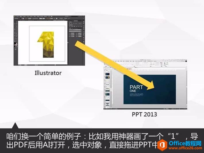 在这个例子中,先用Image Triangulator制作了“1”的低多边形效果,并保存为PDF格式的文件,再用AI(也就是图中的Illustrator)打开,然后复制到PPT里,效果如下: