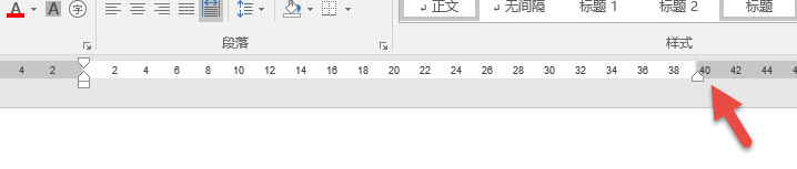 如何进行计算呢?首先要知道Word默认情况下,标尺的刻度为40。40表示在默认字体大小情况一行能写40个汉字。(下图箭头处)