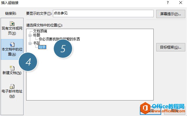 在超链接的菜单界面中,选择链接到“本文档中的位置”。(下图 4 处)并选择之前设置好的“母亲”标签。单击确定后搞定。