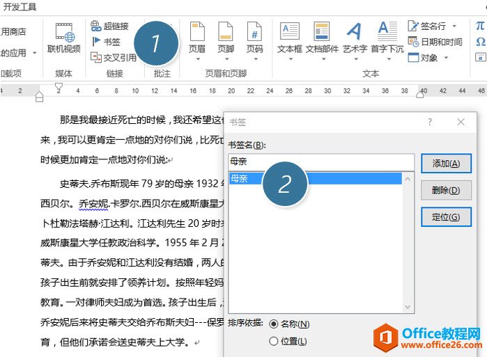 先设置书签,将鼠标定位至 乔布斯母亲 介绍的段落处,点击“插入—书签”按钮,在新弹开的书签窗口中,输入书签名字:母亲。然后确定。(下图 2 处)