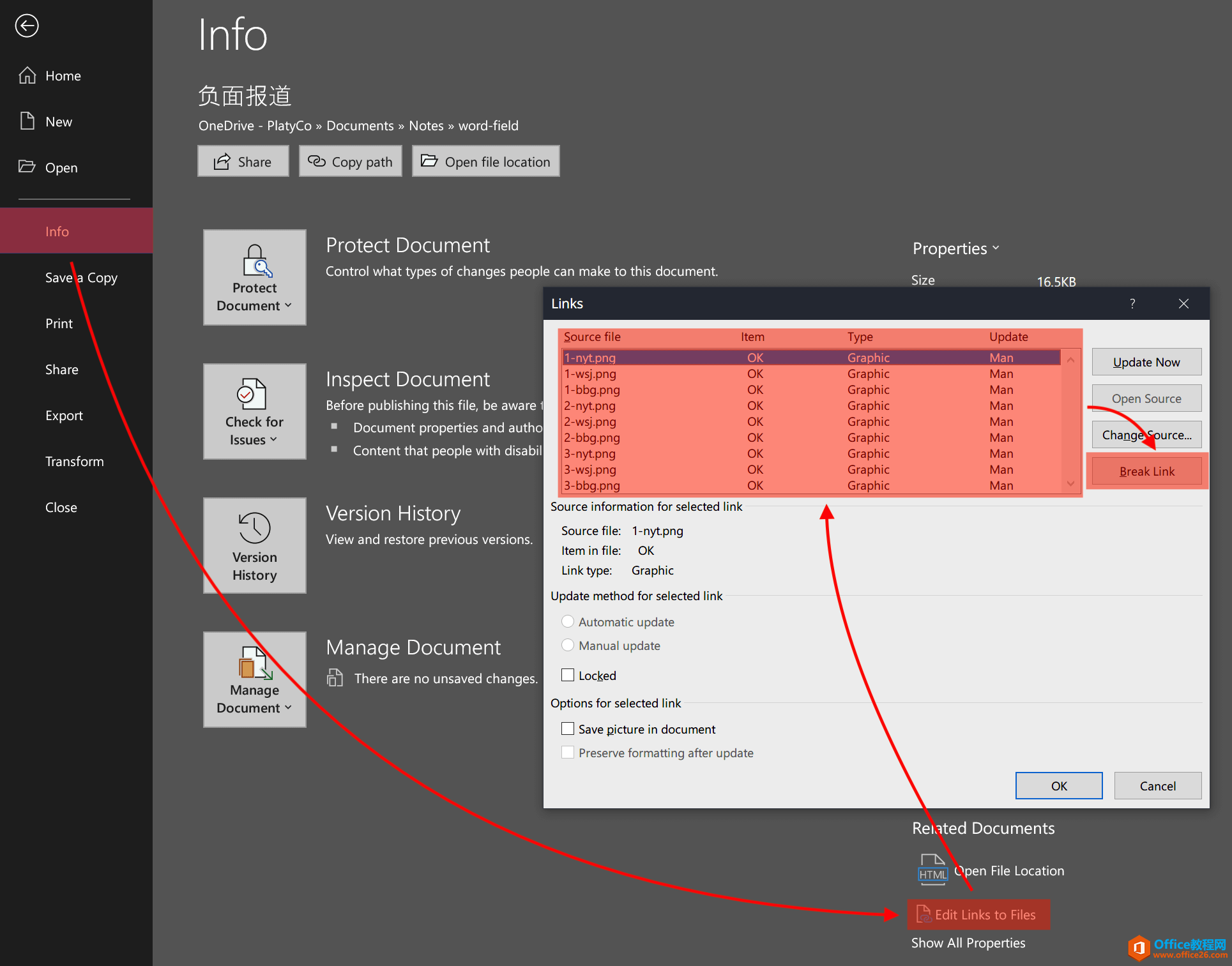 因此,解决的方法就是断开链接,让图片直接存储在文档内部。首先确保文件内容无误、图片均能正常显示。然后,对于 Windows 版 Word,点击「文件」>「信息」,然后在右下角的「相关文档」 下, 单击「编辑文件链接」;对于 Word for Mac,点击「编辑」>「链接…」。在弹出的对话框中,选中所有图片链接,然后单击「断开链接」。这样,以链接形式插入的图片就被固化在文档内部了。