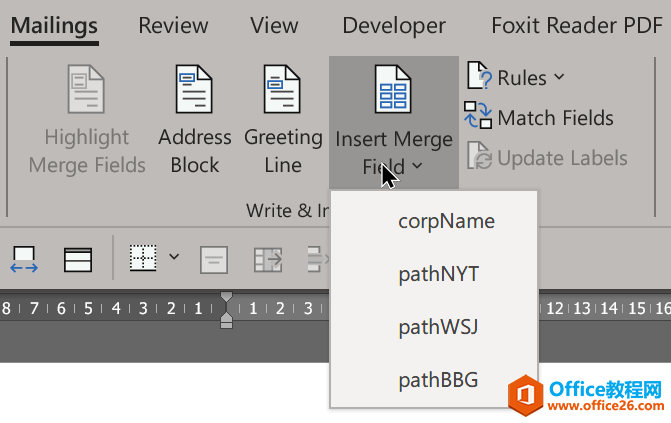 这时,在「插入合并域」的下拉菜单中,就可以看到我们在表格第一行填写的变量名称了。