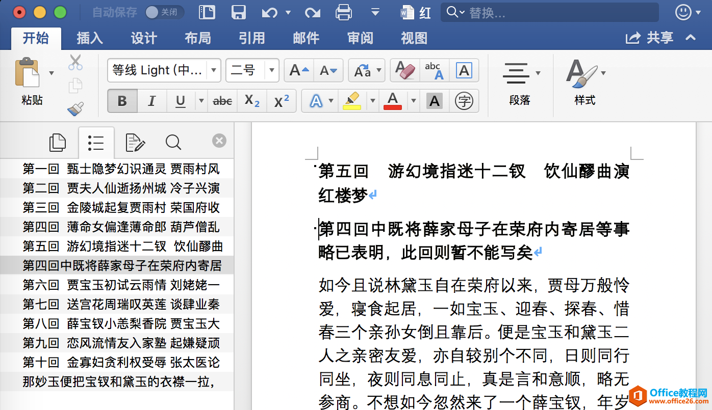 我们会发现,从「第一回」到「第十回」在内的十个章节标题,都已经使用了「标题1」样式。这是因为我们查找的是「第?回」,中间一个 ? 代表「第」和「回」之间只有一个字符,因此接下来我们还要查找「第??回」、「第???回」等等并替换样式为「标题1」,来使全文所有标题都进行样式替换。