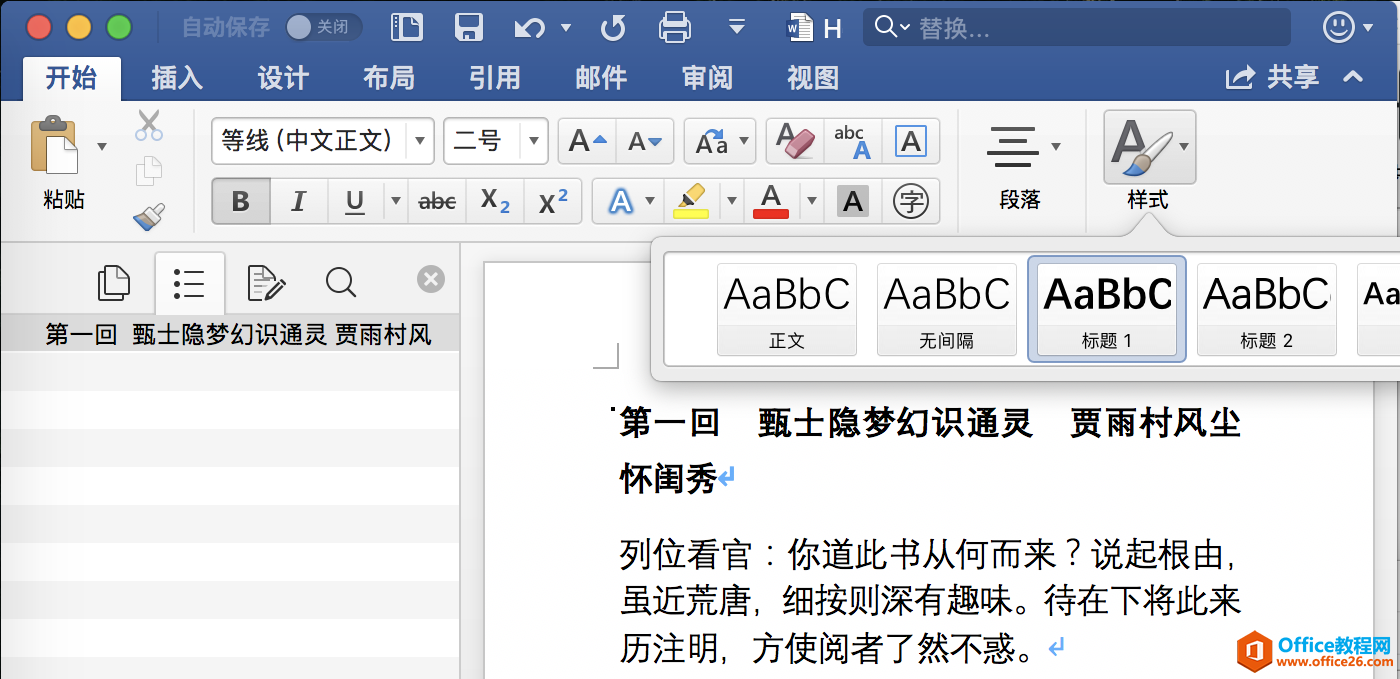 处理书籍章节的操作是,为章节名添加「样式」, 使用「标题1」样式即可。我个人建议是在文本正文中,删除书籍名和作者信息,因为我们可以生成书籍封面来替代这些信息。