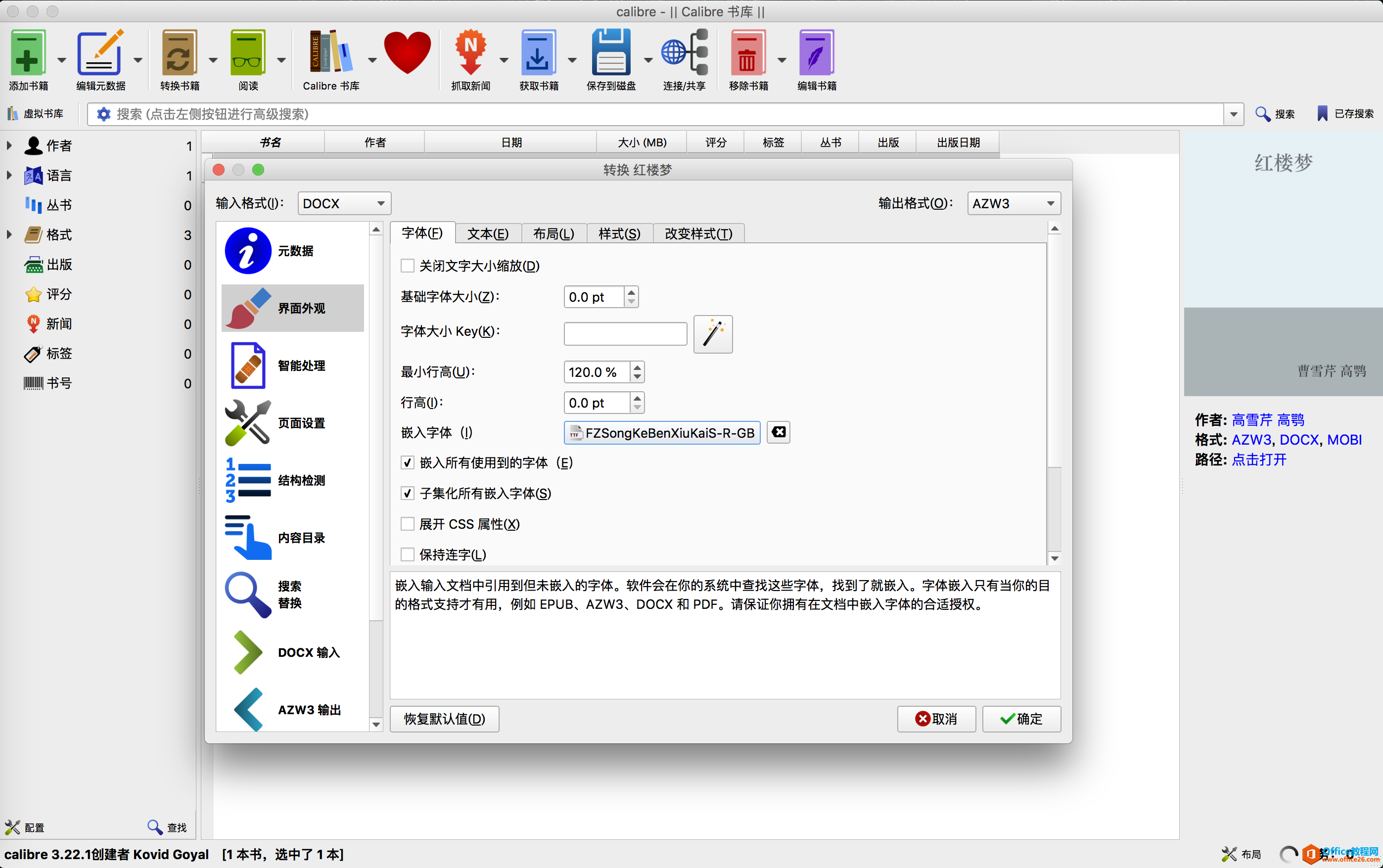 第一个是为电子书阅读器嵌入字体,我们知道没有越狱的 Kindle 只能使用默认的几个字体,如果你想为自制的电子书使用特别的字体,用 Cailbre 也能轻松做到。需要注意的是,只有转换为 awa3 格式才能嵌入字体。