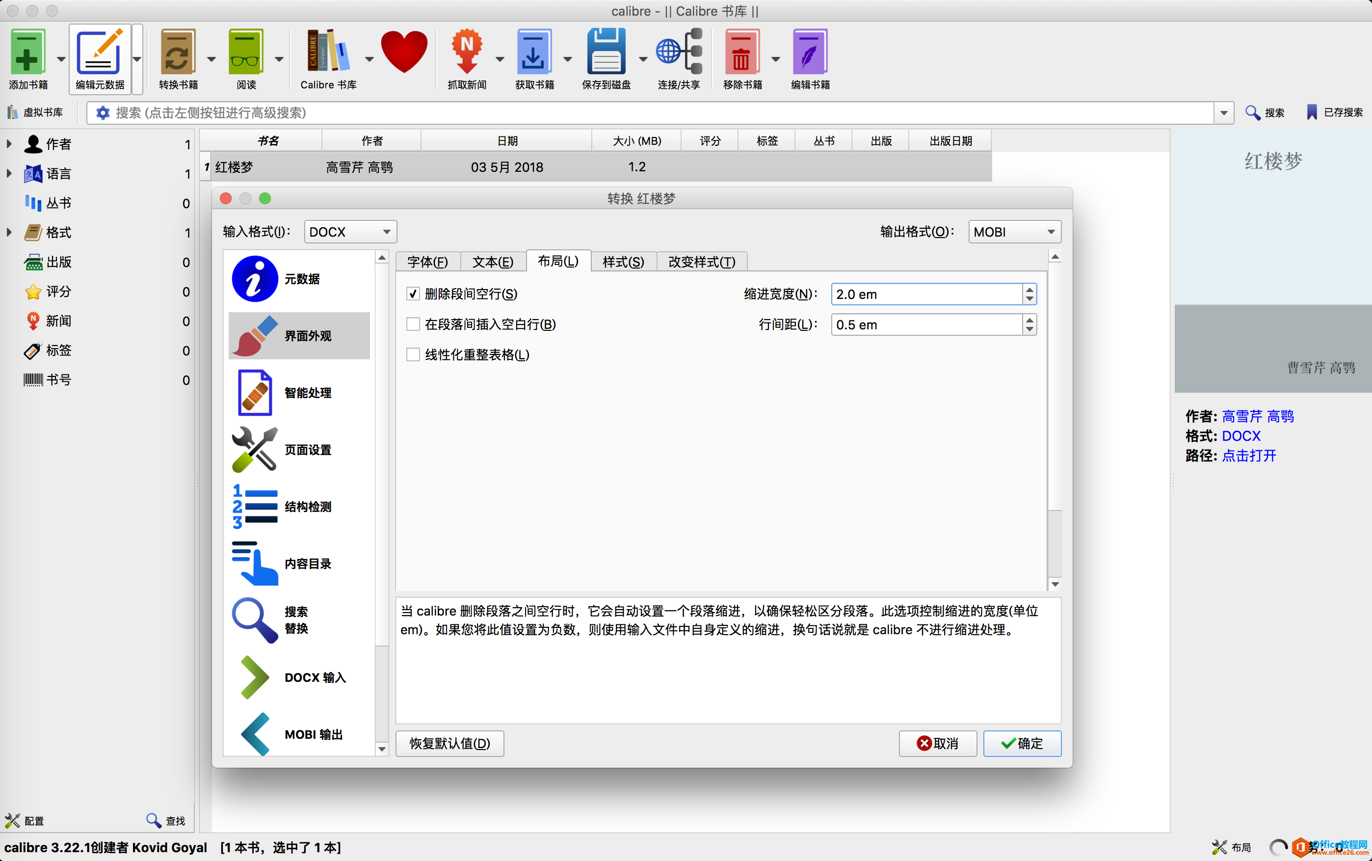 首先将右上角输出格式切换为 mobi 等 Kindle 支持的格式,然后在「界面外观」-「布局」中勾选「删除段间空行」并将「缩进宽度」修改为「2 em」,这样书籍的每段首行都会被设置为首行缩进 2 字符。