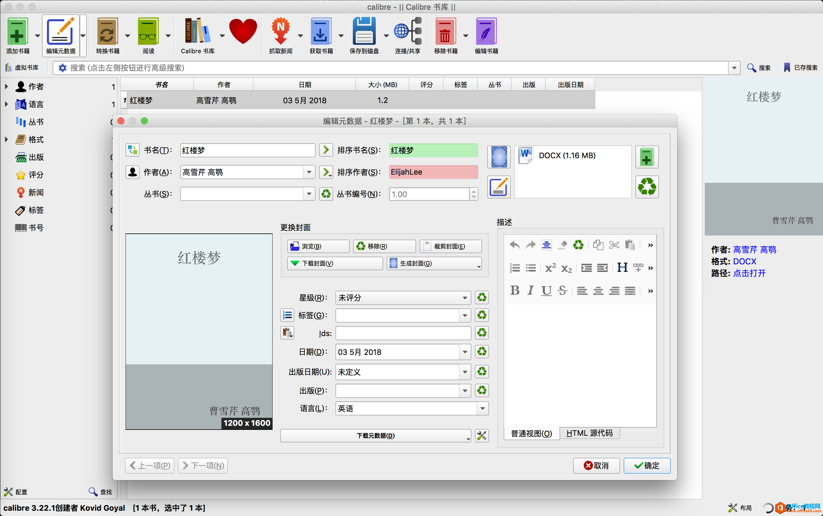 我们先把 Word 书籍直接拖动到 Calibre 窗口中,然后点击「编辑元数据」-「逐个修改元数据」,修改书籍的书名、作者等信息。在封面栏中,我们可以使用「下载封面」功能,把 Amazon 等平台上关于这本书的书籍封面下载下来。我们也可以使用「生成封面」功能,来让 Calibre 自动生成一些简约的封面样式。