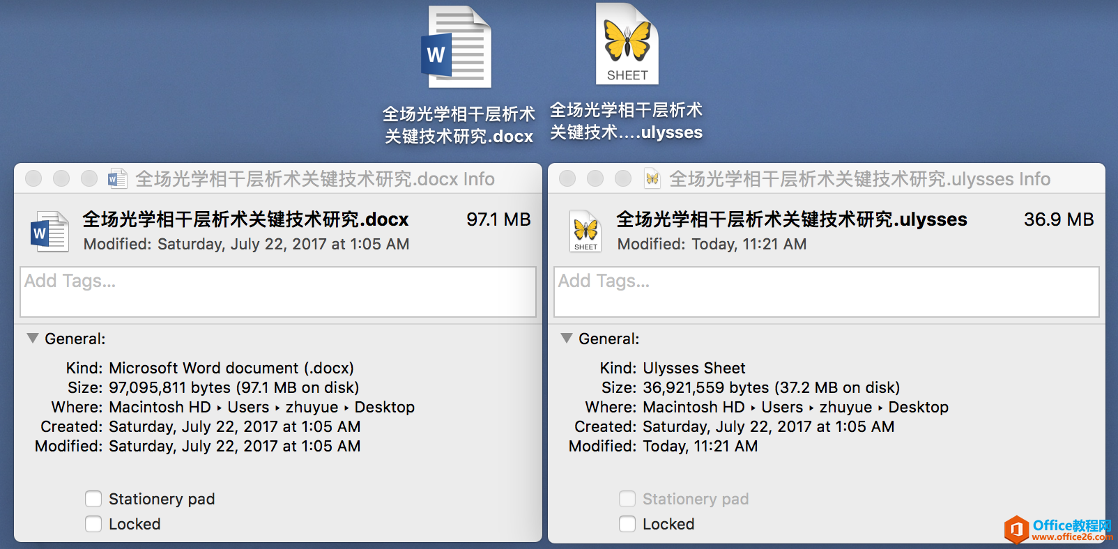 根据我的经验,相同的文档在 Ulysses 下打开要比 Word 小。比如下面这篇我自己的博士论文,在 Ulysses 中把文章直接拖出来得到 36.9MB,而 .docx  档有 97.1MB,虽然没有数量级的差距,但是 Word 加载速度不如 Ulysses,且 Ulysses 我可以随时用 iOS 设备进行修改。