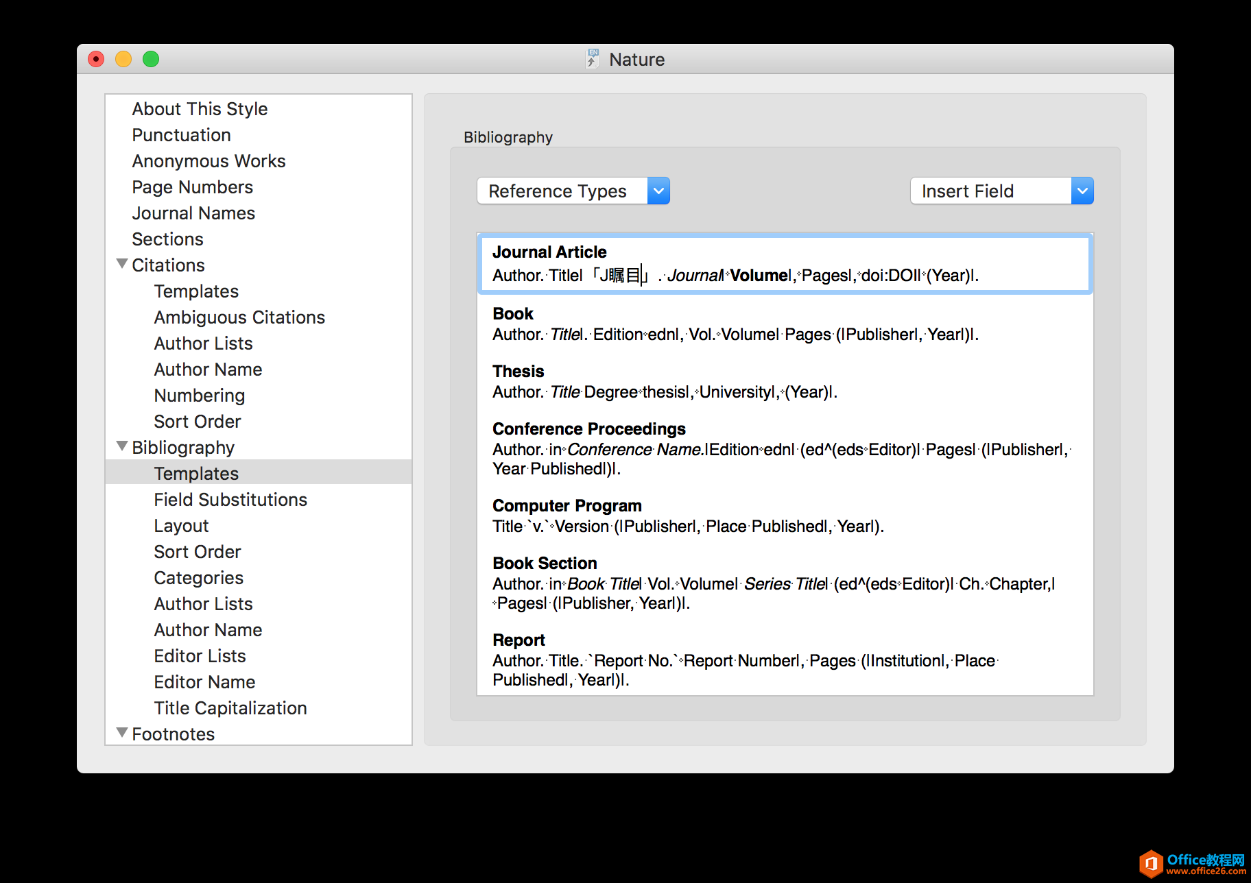 然后进入 「Bibliography – Templates」,在 Journal Article 中 Title 后增加 「J 瞩目」