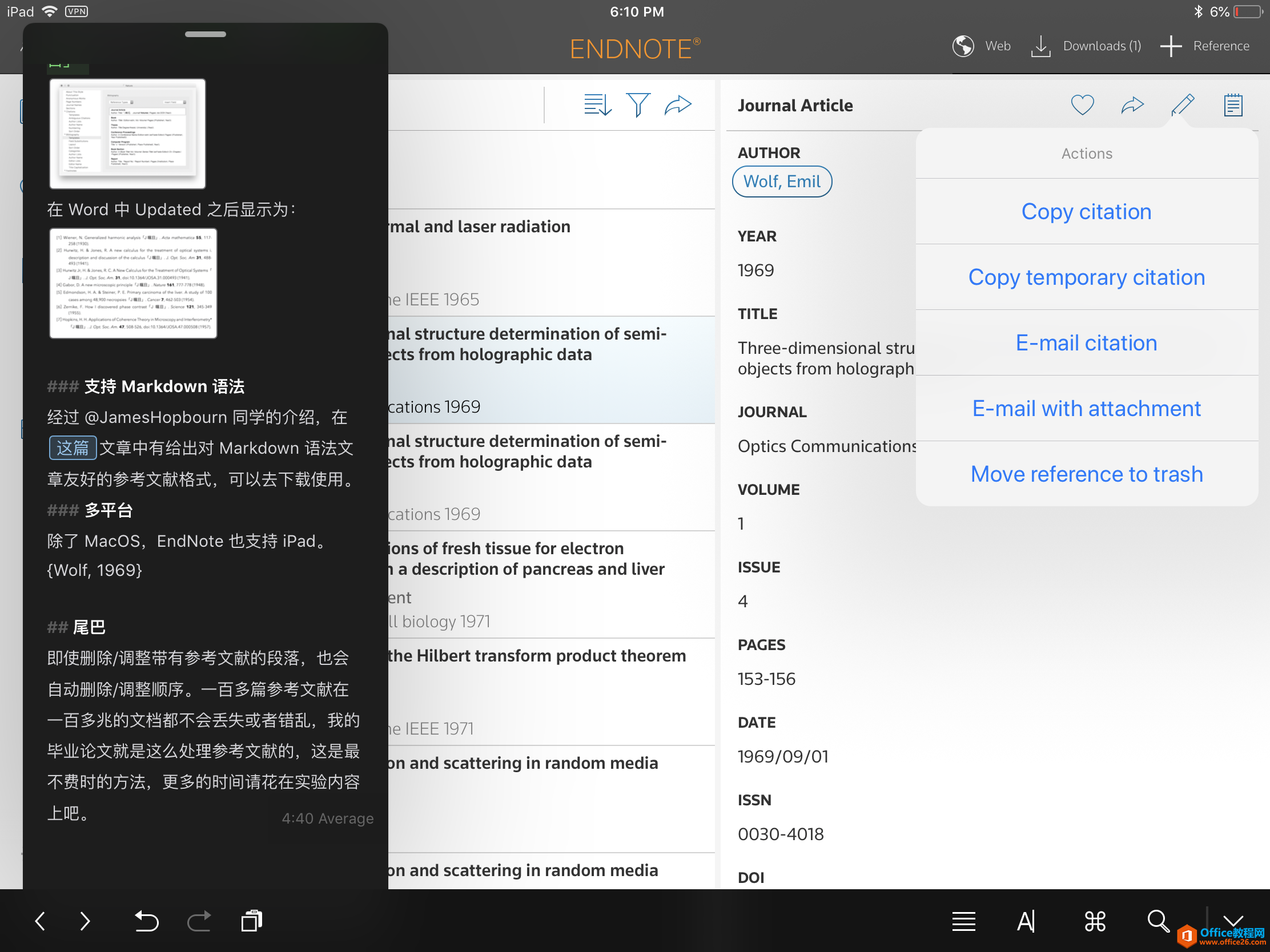 图中显示的是 iPad 上的 EndNote 和 Ulysses 的悬浮窗口。如图显示的可执行任务(Actions)可用来引文。其中,Temporary citation 为 {Wolf, 1969},  citation 为: