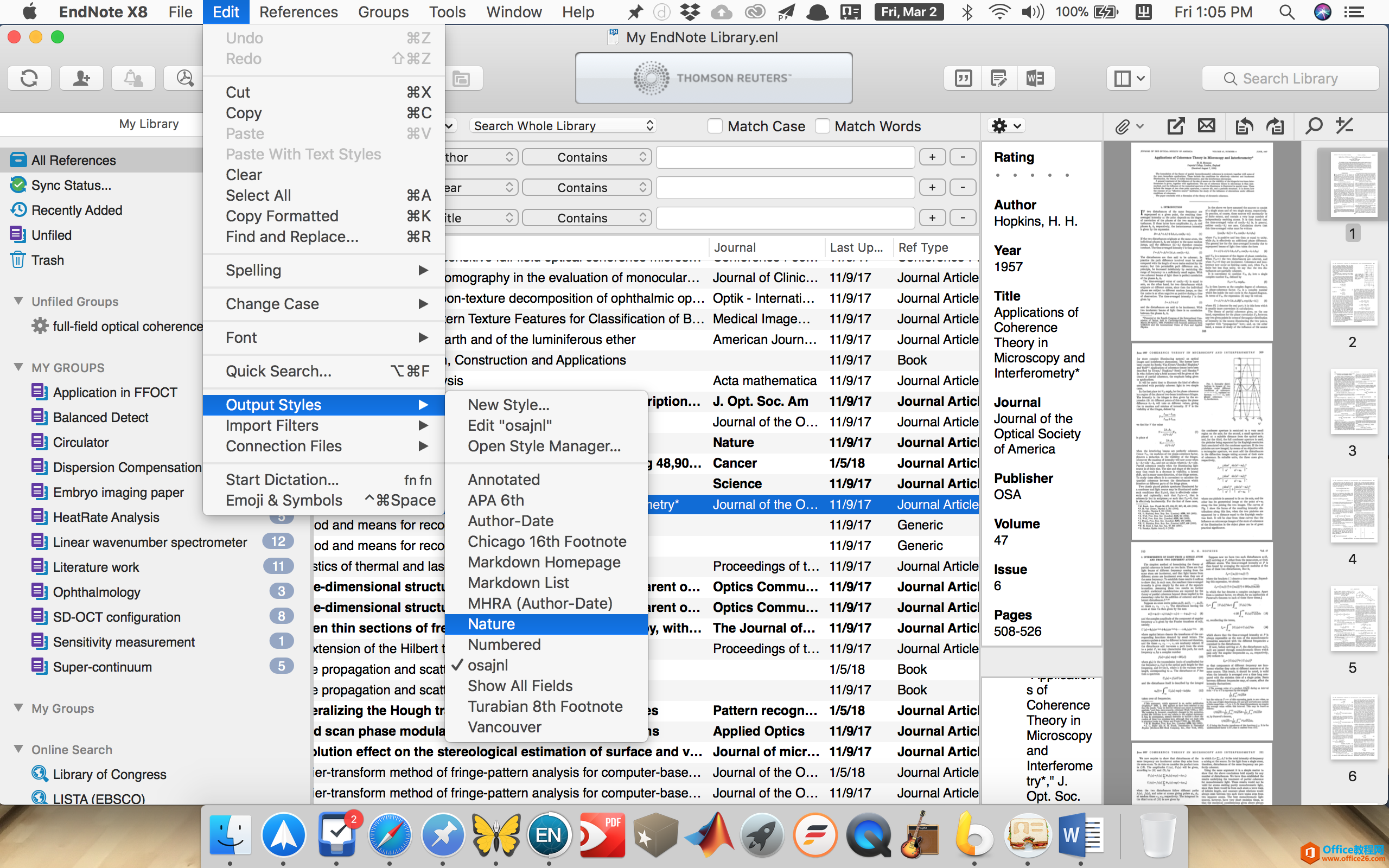 如果是国内学术论文杂志,要用 J/M 这些大写字母和方括号来表示,虽然非常蠢,但是也有办法解决。这些格式修改的操作,跟 Word 和 Ulysses 就没有关系了,要进入 EndNote 这个软件修改。比如我们修改 Nature 杂志的格式,进入 「EndNote – Edit – Output styles – Nature/Edit Nature」: