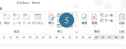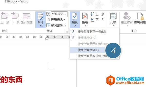 方法很简单,点击“接收”或”拒绝“修订按钮,可以单击下图中的“接收所有修订“(下图 4 处)