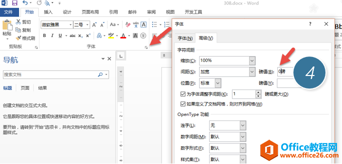 点击“开始-字体—对话框启动器”,在“字体-高级-间距”将磅数改为“0”(下图4处)